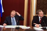Президент Калмыкии Кирсан Илюмжинов (слева), президент республики Мордовия Николай Меркушкин (второй слева) и первый заместитель председателя Правительства России Виктор Зубков (справа) во время заседания межведомственной рабочей группы Совета при Президенте России по вопросу "О ходе и перспективах реализации государственной программы развития сельского хозяйства на 2008-2012 годы".