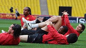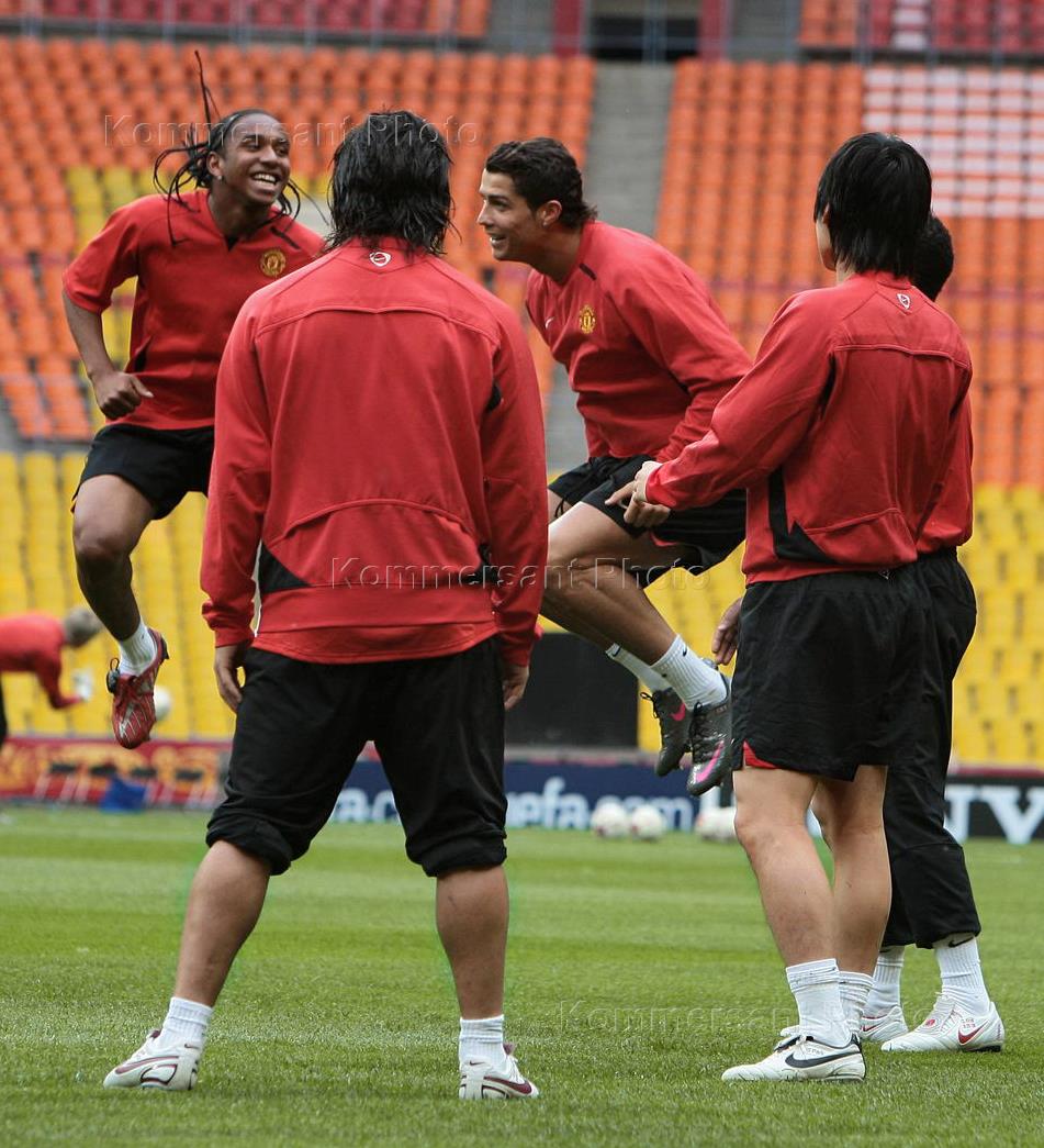 Игроки британской футбольной команды "Манчестер Юнайтед" Андерсон (слева) и Криштиану Роналду (второй справа) на тренировке своей команды в спорткомплексе "Лужники".