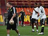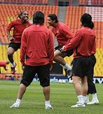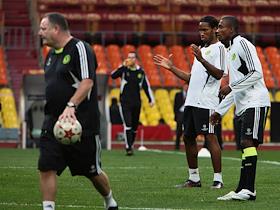 Игроки британской футбольной команды "Челси" Дидье Дрогба (второй справа) и Саломон Калу (справа) на тренировке своей команды в спорткомплексе "Лужники".