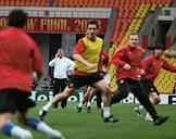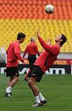 Вратарь британской футбольной команды "Манчестер Юнайтед" Эдвин Ван Дер Сар (справа) на тренировке своей команды в спорткомплексе "Лужники".