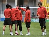 Главный тренер британской футбольной команды "Манчестер Юнайтед" Сэр Алекс Фергюсон (второй справа) на тренировке своей команды в спорткомплексе "Лужники".