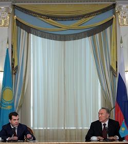 Первый зарубежный государственный визит Президента России в Казахстан. Глава Федерального агентства по атомной энергии (Росатом) Сергей Кириенко (слева) и министр иностранных дел России Сергей Лавров (справа) перед началом официальной встречи президентов России и Казахстана. Встреча прошла в президентском дворце "Ак Орда".