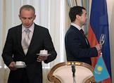 Первый зарубежный государственный визит Президента России в Казахстан. Министр обороны России Анатолий Сердюков (слева) и министр регионального развития России Дмитрий Козак (справа) перед началом официальной встречи президентов России и Казахстана. Встреча прошла в президентском дворце "Ак Орда".
