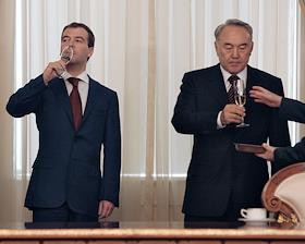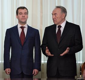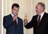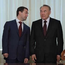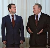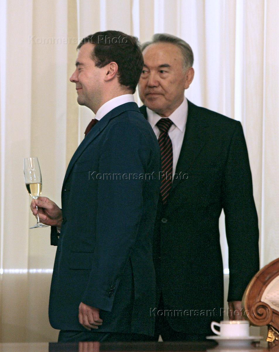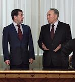 Первый зарубежный государственный визит Президента России в Казахстан. Президент России Дмитрий Медведев (справа) на официальной встрече с президентом Казахстана Нурсултаном Назарбаевым. Встреча прошла в президентском дворце "Ак Орда".