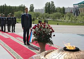 Первый зарубежный государственный визит Президента России в Казахстан. Президент России Дмитрий Медведев возложил цветы к вечному огню у подножия монумента "Родина-Мать" мемориала "Защитники Отечества".