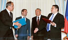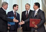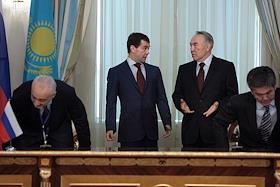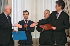 Первый зарубежный государственный визит Президента России в Казахстан. Президент России Дмитрий Медведев (второй слева), президент Казахстана Нурсултан Назарбаев (второй справа) и генеральный директор ГК "Российская корпорация нанотехнологий" Леонид Меламед (слева) во время официальной встречи. Во время встречи были подписаны двусторонние документы. Встреча прошла в президентском дворце "Ак Орда".