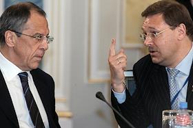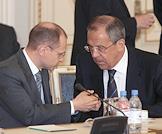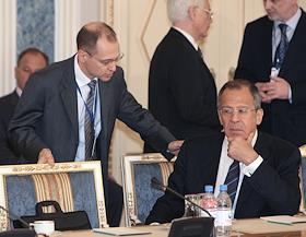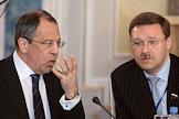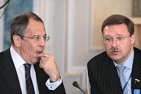 Первый зарубежный государственный визит Президента России в Казахстан. Министр иностранных дел России Сергей Лавров (слева) и председатель Комитета Государственной Дума России по международным делам Константин Косачев (справа) перед началом официальной встречи президентов России и Казахстана. Встреча прошла в президентском дворце "Ак Орда".