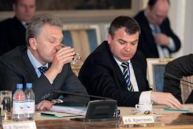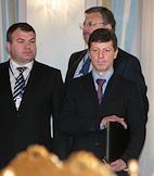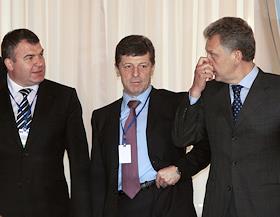 Первый зарубежный государственный визит Президента России в Казахстан. Министр обороны России Анатолий Сердюков (слева), министр регионального развития России Дмитрий Козак (в центре) и министр промышленности и энергетики России Виктор Христенко (справа) перед началом официальной встречи президентов России и Казахстана. Встреча прошла в президентском дворце "Ак Орда".