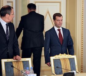 Первый зарубежный государственный визит Президента России Дмитрия Медведева (справа) в Казахстан. Министр иностранных дел России Сергей Лавров (слева) перед началом официальной встречи президентов России и Казахстана. Встреча прошла в президентском дворце "Ак Орда".