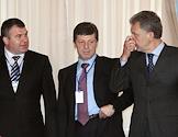 Первый зарубежный государственный визит Президента России в Казахстан. Министр энергетики России Сергей Шматко (слева), министр обороны России Анатолий Сердюков (в центре) и министр регионального развития России Дмитрий Козак (справа) перед началом официальной встречи президентов России и Казахстана. Встреча прошла в президентском дворце "Ак Орда".