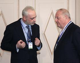 Первый зарубежный государственный визит Президента России в Казахстан. Генеральный директор ГК "Российская корпорация нанотехнологий" Леонид Меламед (слева) и губернатор Свердловской области Эдуард Россель (справа) перед началом официальной встречи президентов России и Казахстана. Встреча прошла в президентском дворце "Ак Орда".
