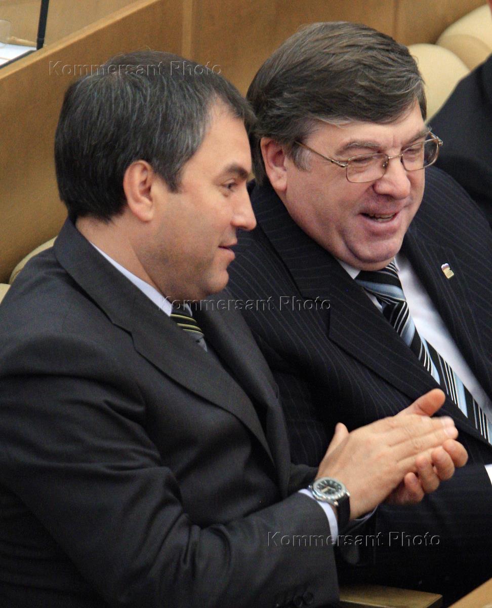 Председатель Комитета Государственной Думы России по вопросам местного самоуправления Вячеслав Тимченко (слева) и губернатор Рязанской области Олег Ковалев (справа) на заседании Госдумы.
