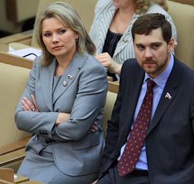 Член Комитета Государственной Думы России по собственности Екатерина Семенова (слева) и первый заместитель председателя Комитета Государственной Думы России по обороне Игорь Баринов (справа) во время заседания Госдумы.