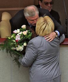 Председатель Совета Федерации России Сергей Миронов (слева) и первый заместитель председателя Комитета Государственной Думы России по культуре Елена Драпеко (справа) на заседании Госдумы.