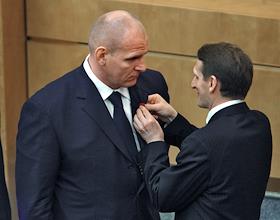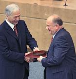 Председатель Совета Федерации Сергей Миронов (справа) вручил почетную грамоту Совета Федерации Федерального Собрания России председателю Государственной Думы России Борису Грызлову (слева).