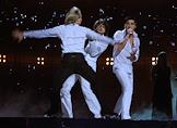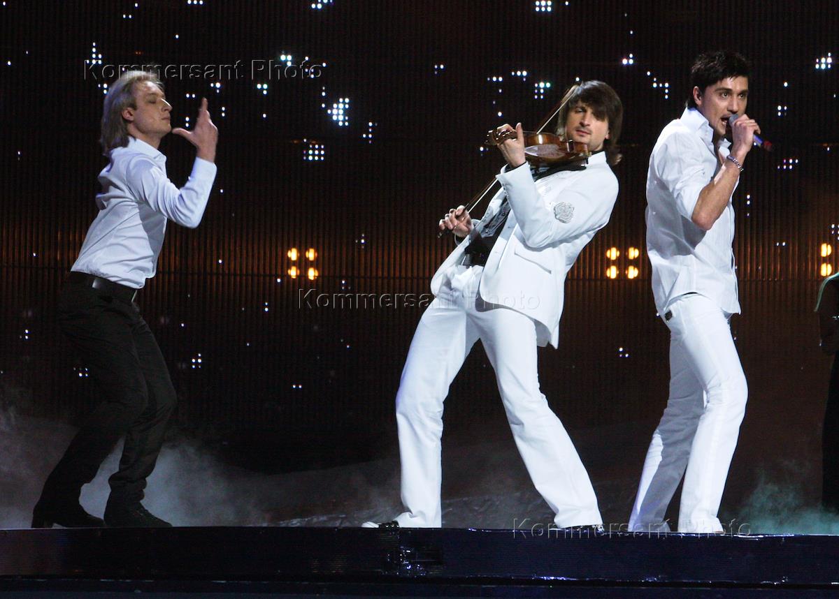 Международный конкурс песни "Евровидение 2008". Венгерский скрипач Эдвин Мартон (в центре), певец Дима Билан (справа) и депутат Законодательного собрания Санкт-Петербурга, олимпийский чемпион по фигурному катанию Евгений Плющенко (слева) во время генеральной репетиции финала конкурса.