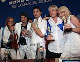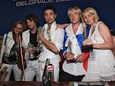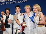 Международный конкурс песни "Евровидение 2008". Венгерский скрипач Эдвин Мартон (слева), певец Дима Билан (в центре), депутат Законодательного собрания Санкт-Петербурга, олимпийский чемпион по фигурному катанию Евгений Плющенко (второй справа) и продюсер Яна Рудковская (справа) во время пресс-конференция после объявления результатов голосования конкурса "Евровидение-2008". Дима Билан стал победителем конкурса.