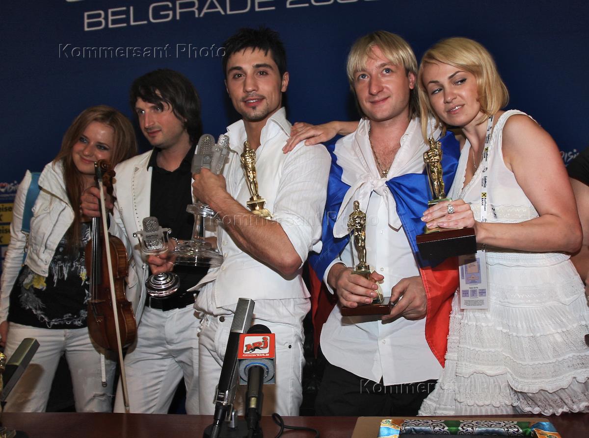 Международный конкурс песни "Евровидение 2008". Венгерский скрипач Эдвин Мартон (второй слева), певец Дима Билан (в центре), депутат Законодательного собрания Санкт-Петербурга, олимпийский чемпион по фигурному катанию Евгений Плющенко (второй справа) и продюсер Яна Рудковская (справа) во время пресс-конференция после объявления результатов голосования конкурса "Евровидение-2008". Дима Билан стал победителем конкурса.
