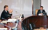 Генеральный директор ООО "Газэкспорт" Александр Медведев (слева) и заместитель председателя правления ОАО "Газпром" Валерий Голубев (справа) во время встречи Президента России Дмитрия Медведева с членами совета директоров и правления РАО "Газпром".