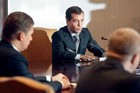 Президент России Дмитрий Медведев (справа) во время встречи с главой РАО "Газпром" Алексеем Миллером (в центре) и руководством ОАО "Газпром".