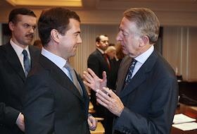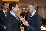 Президент России Дмитрий Медведев (в центре) и председатель правления компании "Рургаз АГ" Буркхард Бергманн (справа) на встрече с членами совета директоров и правления РАО "Газпром".