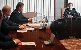 Президент России Дмитрий Медведев (в центре) во время встречи с главой РАО "Газпром" Алексеем Миллером (слева) и руководством ОАО "Газпром".