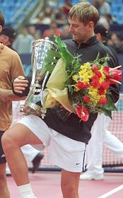 Российский теннисист Евгений Кафельников с главным призом турнира "Кубок Кремля", который состоялся в спортивном комплексе "Олимпийский". Кафельников выиграл в пятый раз "Кубок Кремля", заработанный на турнире гонорар российский теннисист пожертвовал близким тех, кто находился в самолете, потерпевшем крушение рядом с его родным городом Сочи.
