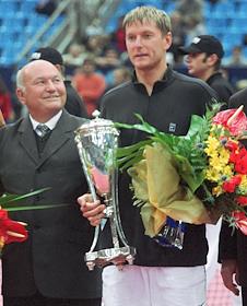 Мэр Москвы Юрий Лужков (слева) и российский теннисист Евгений Кафельников (справа) во время награждения победителя турнира "Кубок Кремля", который состоялся в спортивном комплексе "Олимпийский". Заработанный на турнире гонорар российский теннисист пожертвовал близким тех, кто находился в самолете, потерпевшем крушение рядом с его родным городом Сочи.