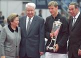 Первый Президент России Борис Ельцин (второй слева), его супруга Наина (слева), российский теннисист Евгений Кафельников (в центре) и главный тренер сборной команды России по теннису Шамиль Тарпищев (справа) во время награждения победителя турнира "Кубок Кремля", который состоялся в спортивном комплексе "Олимпийский". Кафельников выиграл в пятый раз "Кубок Кремля", заработанный на турнире гонорар российский теннисист пожертвовал близким тех, кто находился в самолете, потерпевшем крушение рядом с его родным городом Сочи.