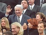 Первый Президент России Борис Ельцин (в центре) на трибуне среди болельщиков финала турнира по теннису "Кубок Кремля", который состоялся в спортивном комплексе "Олимпийский".