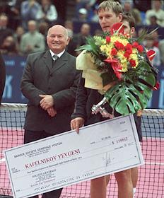 Мэр Москвы Юрий Лужков (слева) и российский теннисист Евгений Кафельников (справа) во время награждения победителя турнира "Кубок Кремля", который состоялся в спортивном комплексе "Олимпийский". Кафельников выиграл в пятый раз "Кубок Кремля", заработанный на турнире гонорар российский теннисист пожертвовал близким тех, кто находился в самолете, потерпевшем крушение рядом с его родным городом Сочи.