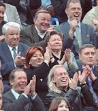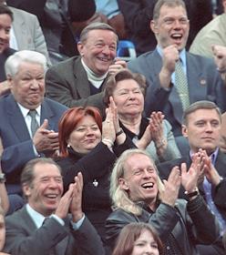 Первый Президент России Борис Ельцин с женой Наиной Ельциной, председатель правительства России Михаил Касьянов и певец Крис Кельми на трибуне во время финала турнира по теннису "Кубок Кремля", который состоялся в спортивном комплексе "Олимпийский".
