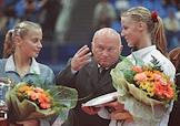 Мэр Москвы Юрий Лужков (в центре), югославская теннисистка Елена Докич (слева) и российская теннисистка Елена Дементьева (справа) во время награждения победителей турнира "Кубок Кремля", который состоялся в спортивном комплексе "Олимпийский".