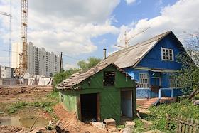 Заколоченный деревянный частный дом на фоне строящегося многоэтажного дома в поселке Бутово.
