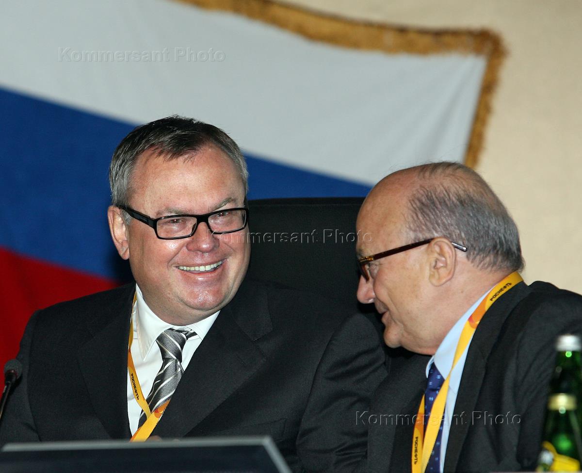 Независимый член Совета директоров ОАО "НК "Роснефть", президент, председатель правления "Внешторгбанка" (ВТБ) Андрей Костин (слева) и независимый член Совета директоров ОАО "НК "Роснефть", председатель Комитета по аудиту, член Комитета по кадрам и вознаграждениям Ханс Йорг Рудлофф (справа) на общем годовом собрании акционеров ОАО "НК "Роснефть".