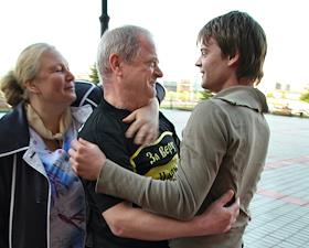 Полковник ГРУ Владимир Квачков (справа) с женой (в центре) и сыном (слева) после освобождения. В Московском областном суде коллегия присяжных оправдала троих обвиняемых по делу о покушении на главу РАО ЕЭС Анатолия Чубайса в марте 2005 года.