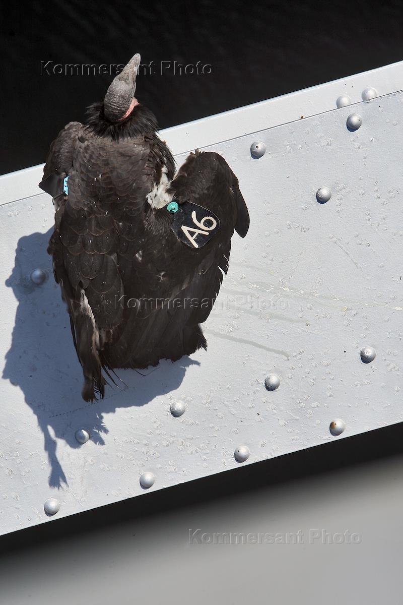 Жанровая фотография. Окольцованная птица сидит на ограждении моста через реку.