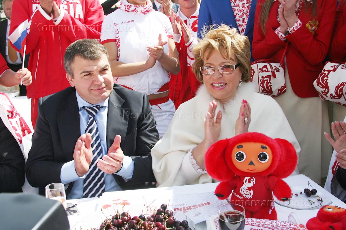 XII Санкт- Петербургский международный экономический форум (СПЭФ). Министр обороны России Анатолий Сердюков (слева) и губернатор Санкт-Петербурга Валентина Матвиенко (в центре) во время презентации олимпийской формы от компании "Bosco sport" в кафе "Красная площадь".