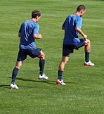 Игроки сборной России по футболу Константин Зырянов (слева) и Сергей Игнашевич (справа) на тренировке перед матчем со сборной командой Испании на чемпионате Европы по футболу 2008.