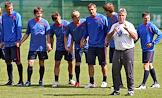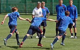 Главный тренер сборной России по футболу Гус Хиддинк (второй справа) и игроки сборной на тренировке перед матчем со сборной командой Испании на чемпионате Европы по футболу 2008.