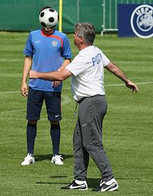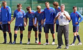 Чемпионат Европы по футболу 2008. Главный тренер сборной России по футболу Гус Хиддинк (справа) на тренировке игроков сборной России перед матчем со сборной Испании.