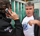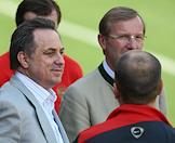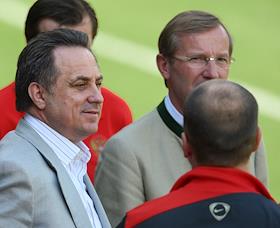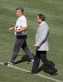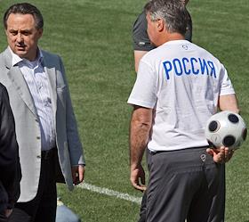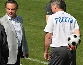 Министр спорта, туризма и молодежной политики России Виталий Мутко (слева) и главный тренер сборной России по футболу Гус Хиддинк (справа) на тренировке игроков сборной перед матчем со сборной командой Испании на чемпионате Европы по футболу 2008.