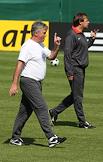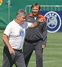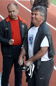 Главный тренер сборной России по футболу Гус Хиддинк (слева) и наставник сборной России по футболу Александр Бородюк (справа) на тренировке игроков сборной перед матчем со сборной командой Испании на чемпионате Европы по футболу 2008.