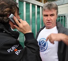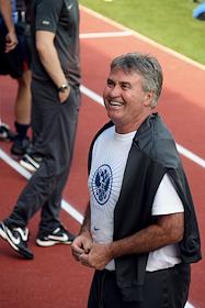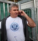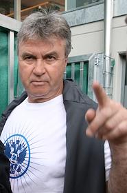 Главный тренер сборной России по футболу Гус Хиддинк на тренировке игроков сборной команды перед матчем со сборной командой Испании на чемпионате Европы по футболу 2008.
