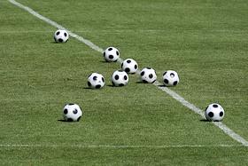 Футбольные мячи на поле во время тренировки игроков сборной команды России перед матчем со сборной командой Испании на чемпионате Европы по футболу 2008.