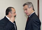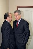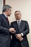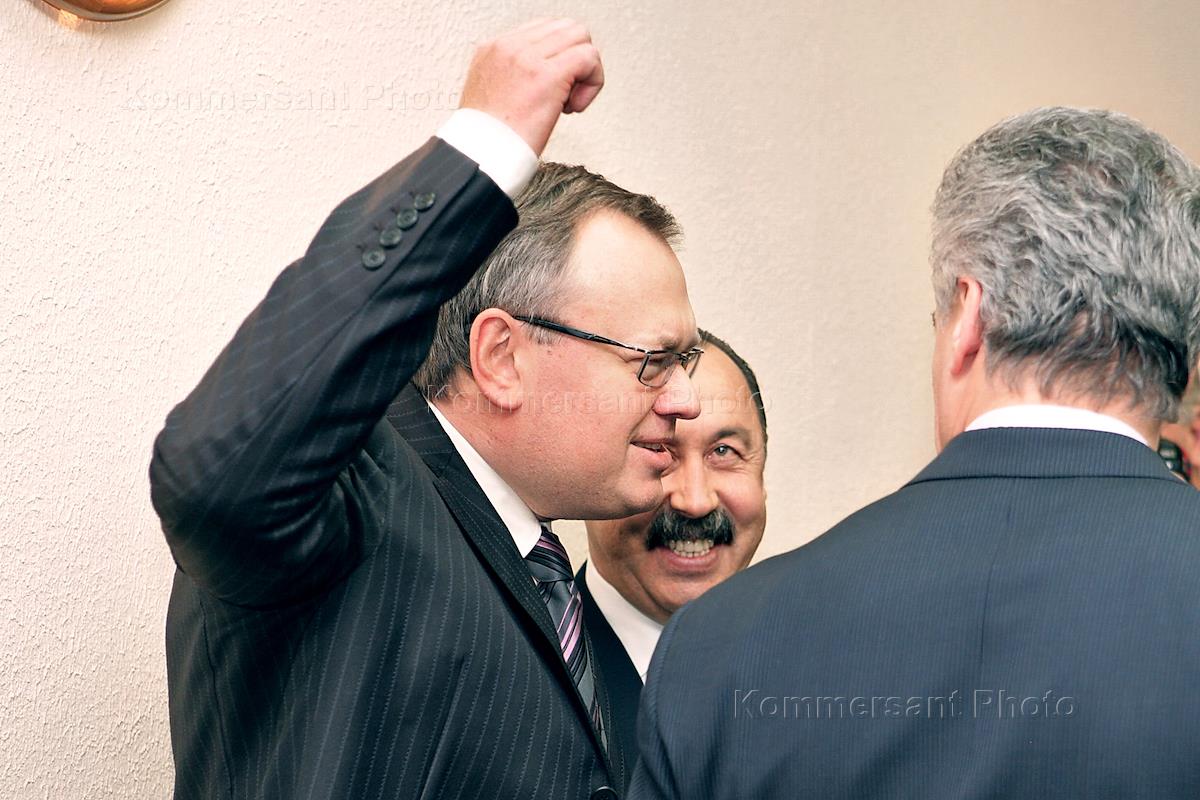 Президент-председатель правления Внешторгбанка Андрей Костин (справа) и помощник Президента России Сергей Ястржембский (слева) во время подписания договора между Внешторгбанком (ВТБ) и Профессиональным клубом "ЦСКА", в соответствии с которым ВТБ получил статус "Генеральный спонсор Профессионального футбольного клуба ЦСКА".