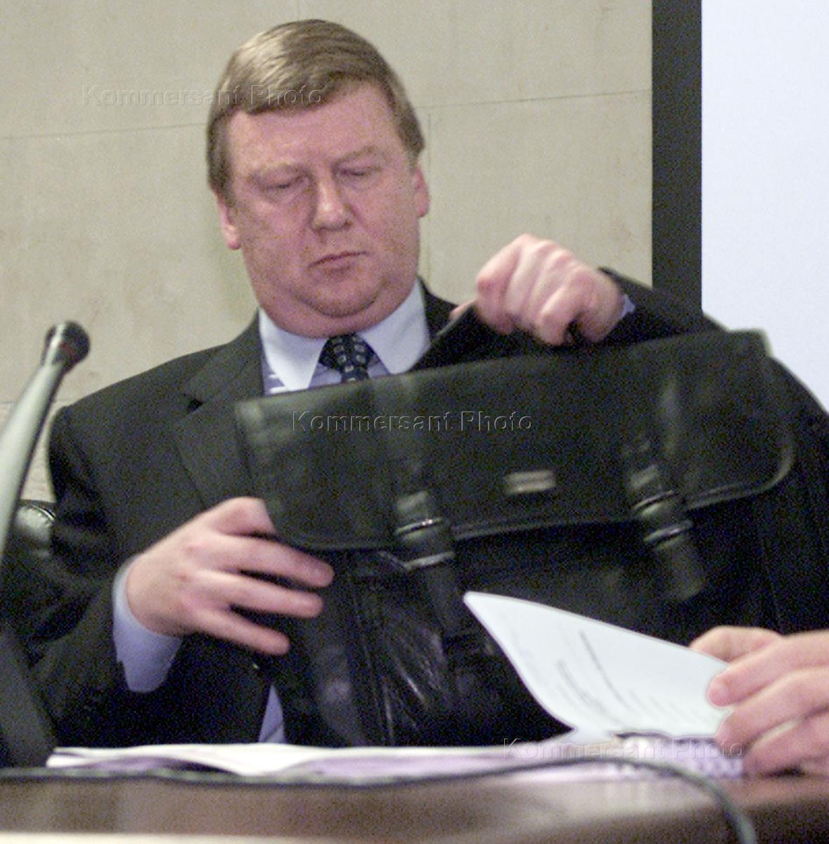 Чрезвычайный и полномочный посол России на Украине Виктор Черномырдин (справа) и председатель правления РАО "ЕЭС России" Анатолий Чубайс (выступает, слева) во время расширенного заседания по вопросам подготовки предприятий энергетики и жилищно-коммунального хозяйства (ЖКХ) к осенне-зимнему сезону. Заседание состоялось в комитете Государственной Думы России по энергетике, транспорту и связи.