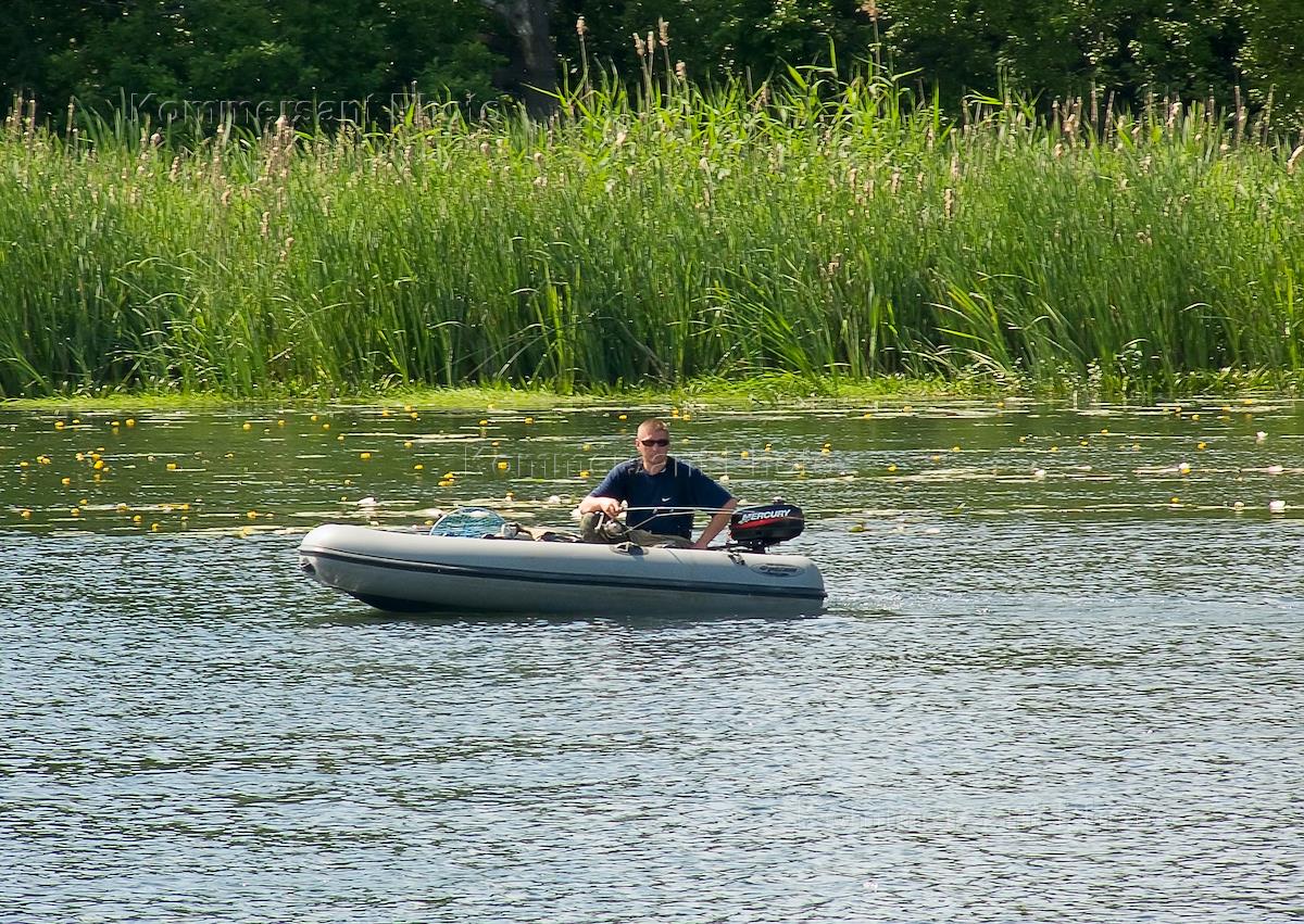 Парень на резиновой лодке с мотором "Mercury" ловит на удочку рыбу на реке Усманка под Воронежем.