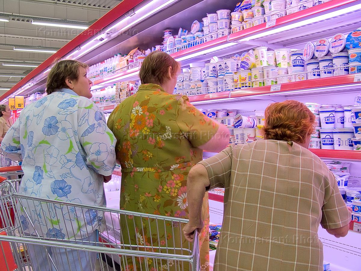 [English translation in progress (2)] Trading hall of a hypermarket " Вестер гипер " the Kaliningrad network of food shops in the city of Voronezh. The housewife and two pensioners choose sour cream in a department of dairy production.