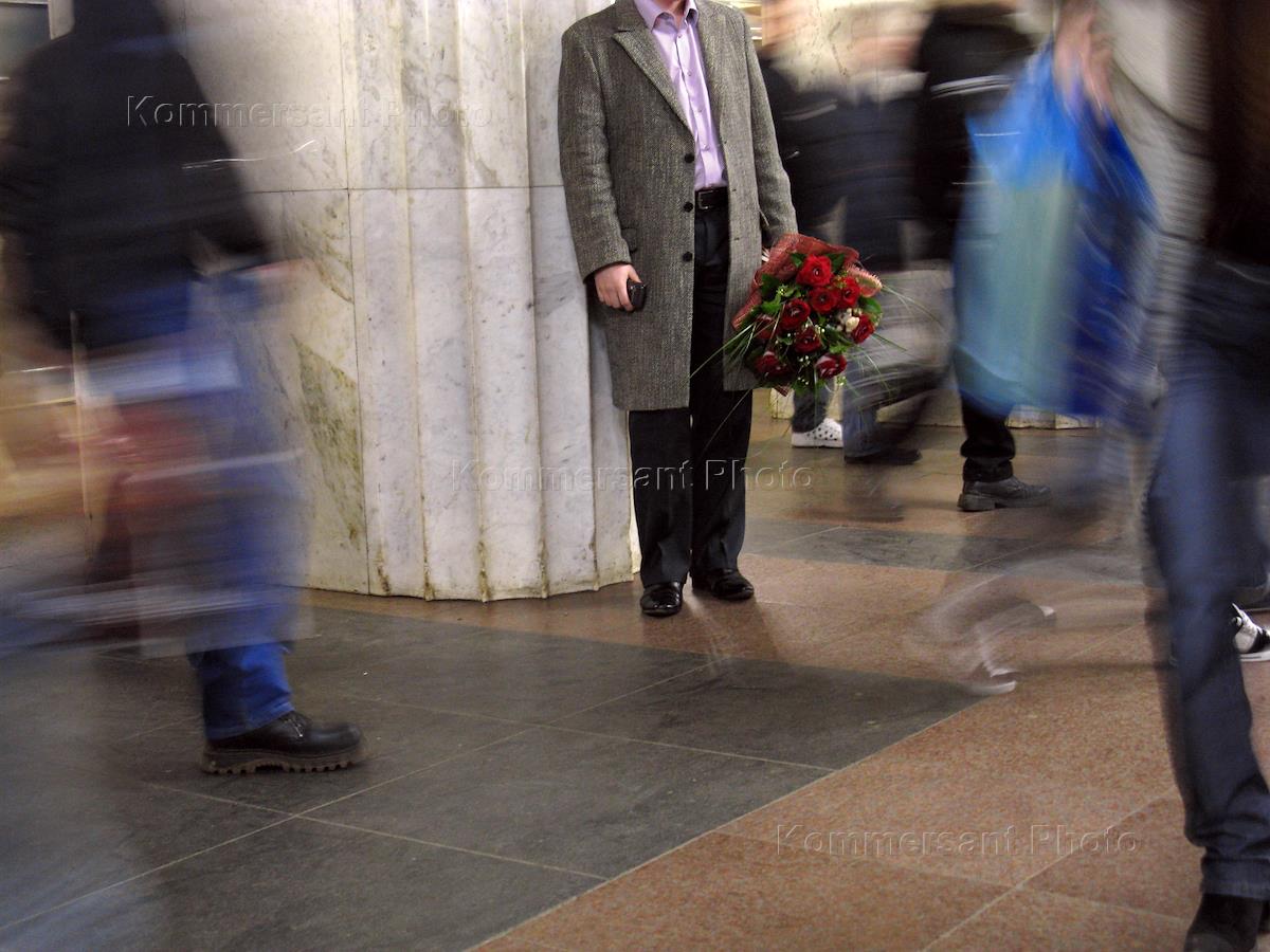 Молодой человек стоит с букетом цветов в вестибюле метро.